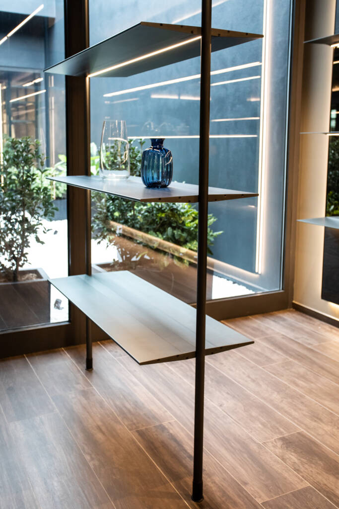 Round 35mm and wide 70mm vertical aluminum profiles — Italian-designed freestanding shelving manufactured in the USA for lasting quality.