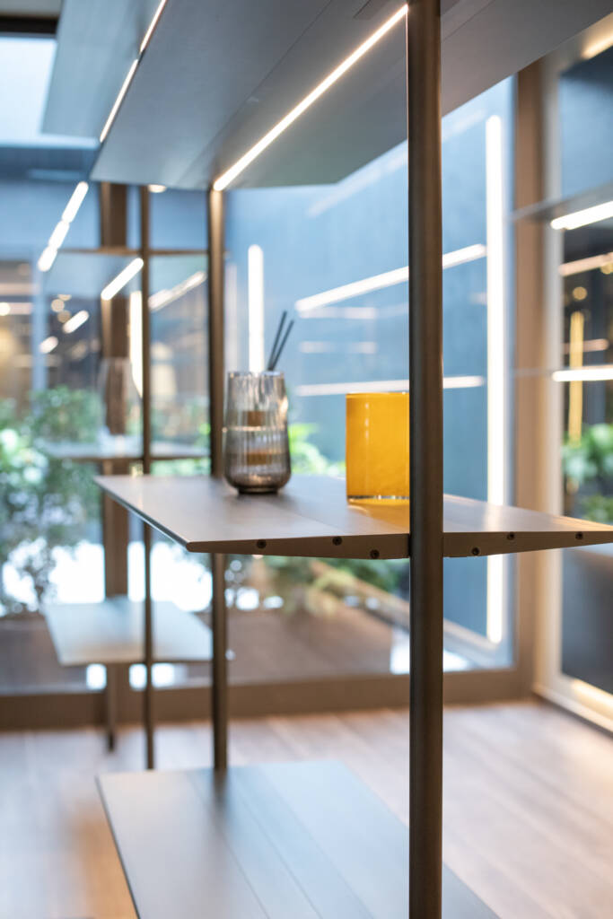 A modular freestanding shelving system with round 35mm vertical profiles. Installs on ceiling, wall, or freestanding. Compatible with metal, wood, and Extra Lait shelves. Vertical profiles can be electrified for integrated shelf lighting.