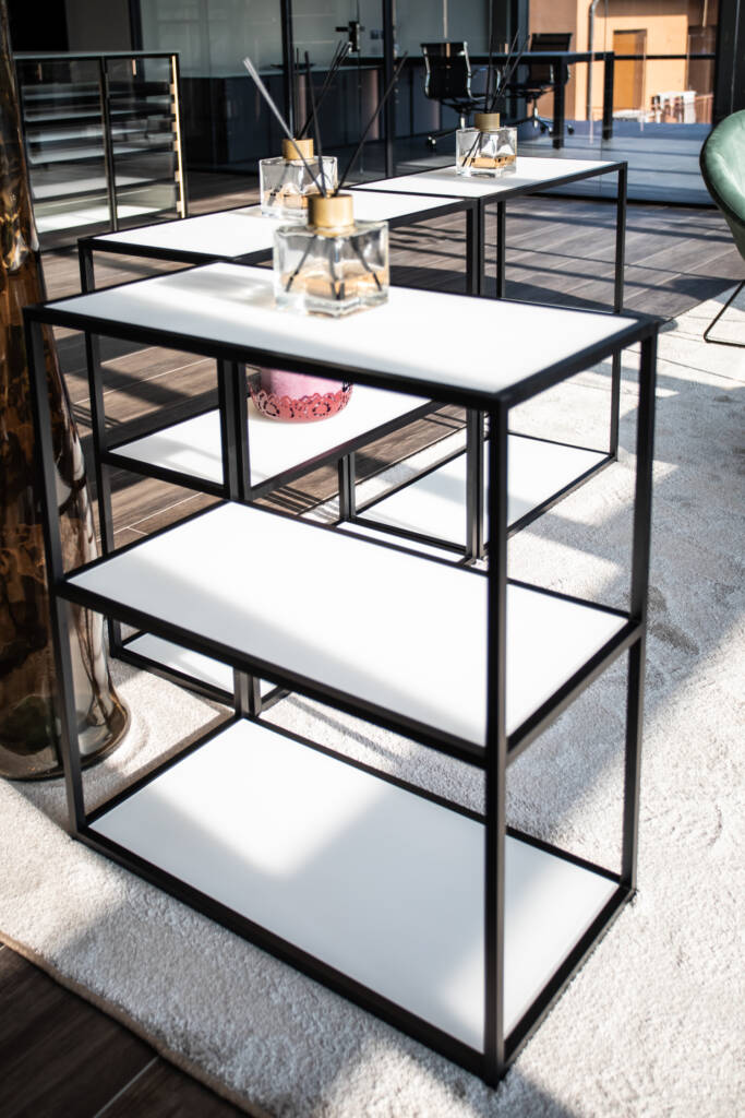 Our freestanding shelving transforms living spaces into curated galleries. Ceiling-to-floor aluminum profiles create striking room dividers or feature walls with adjustable shelf heights for books, art, and decorative objects.
